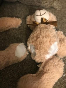 The two trickiest props were two items that had to break each show – a teddy bear and a rustic pottery vase. The teddy bear a.k.a. “Cuddle Bear” took some thinking, but once I figured out how to take the limbs off and add some velcro to them, Cuddle Bear dismembered with ease!