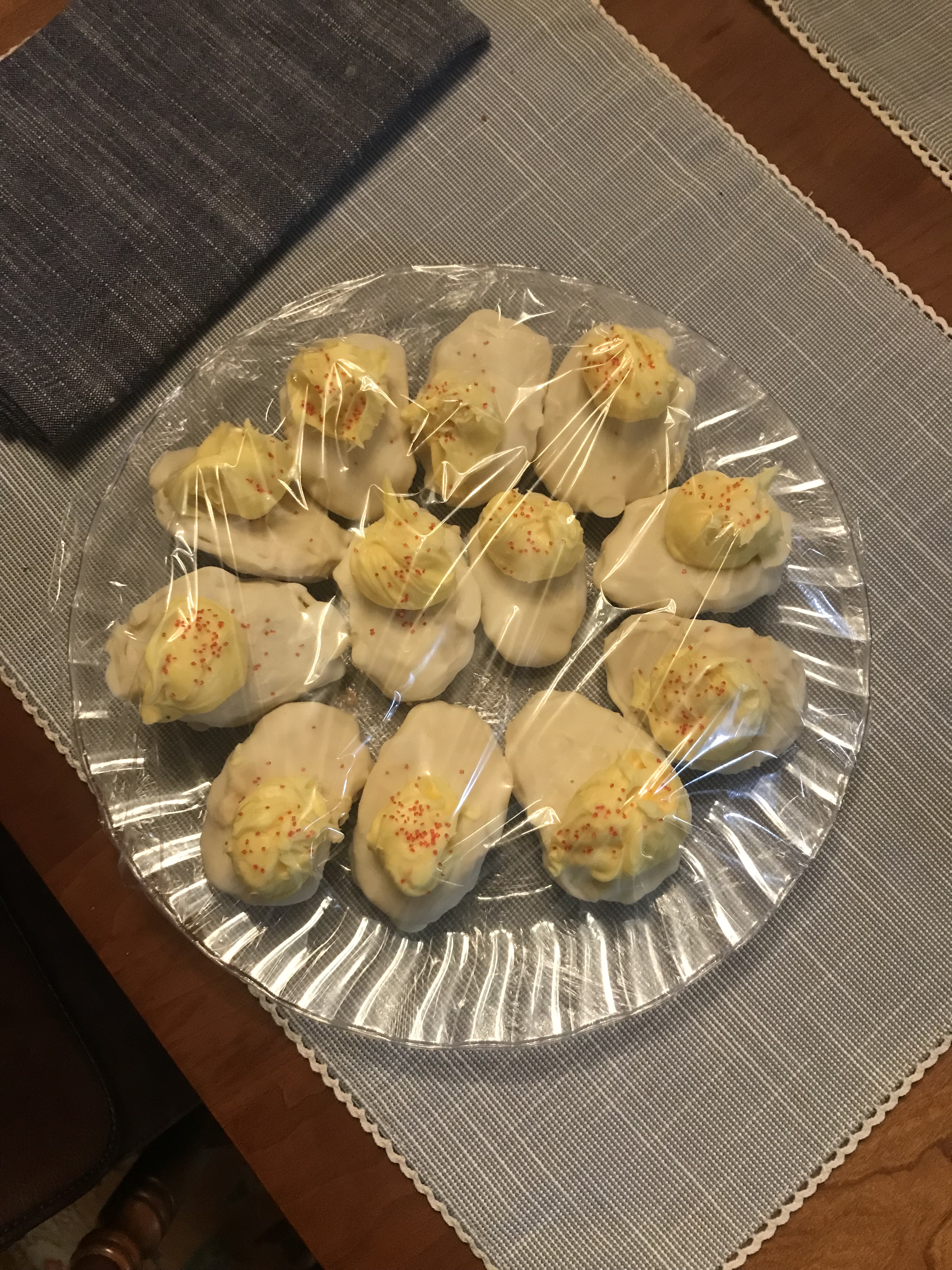 Since the show ran two weekends, we needed to figure out how to make the Southern staple of deviled eggs hold up for two weeks. Enter Pinterest and Google. The director, Jessica, found a recipe for fake deviled eggs made from cake and frosting. Thankfully, the actors did not eat them on stage, so I did not have to keep making batches of these eggs, but they were as hard as a rock at the end of the show! I used some of the same cake mix to make the fake mini quiches as well.