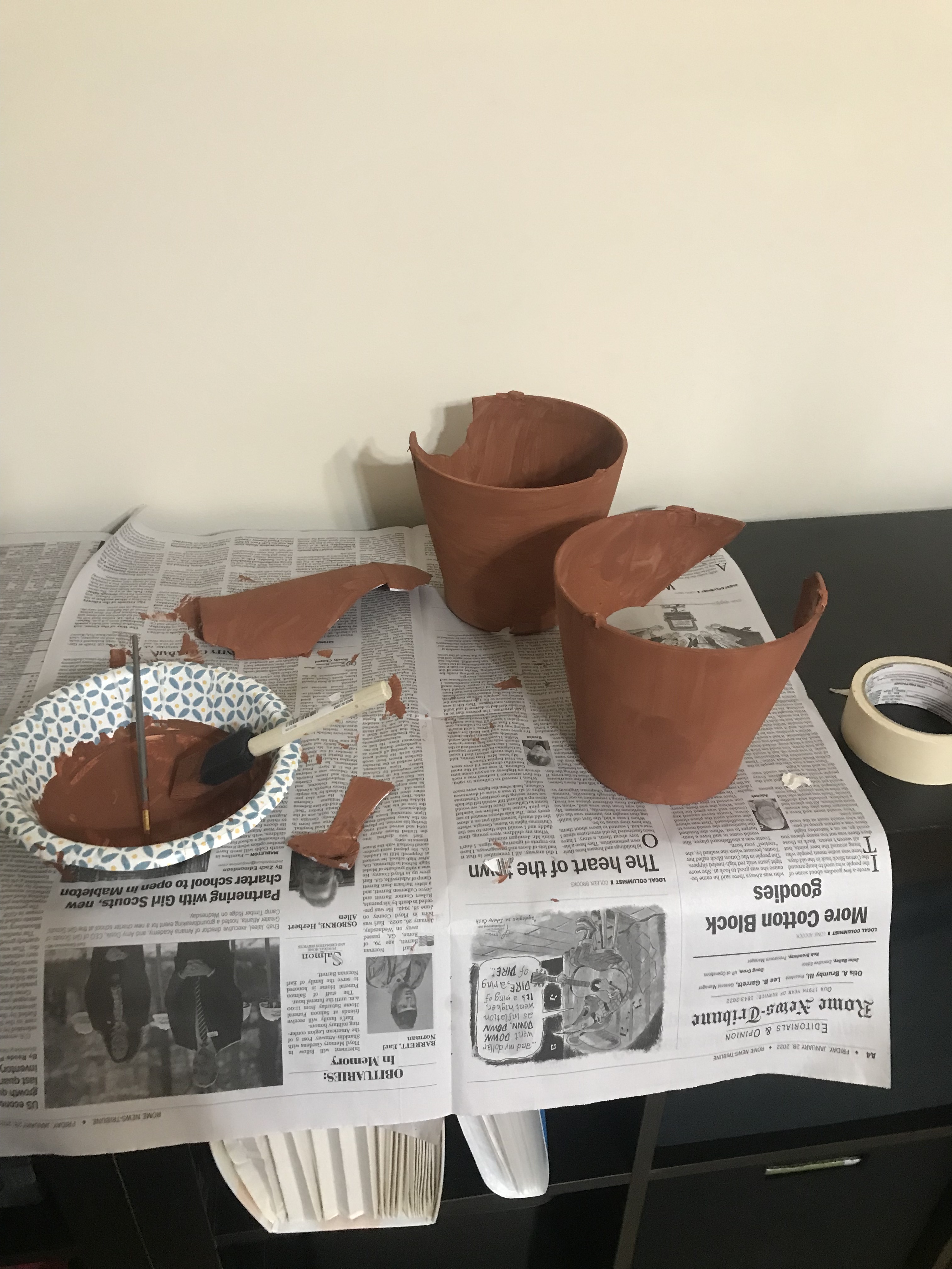 The vase, a.ka. the “Judith Jane,” was much more labor-intensive. Often, if a script calls for a prop to break, productions will get special breakaway pieces that break safely. Usually, productions will get one breakaway piece for each showtime. However, our prop budget was only $350 and most breakaway vases run $60 a pop. Katie thankfully found a video of a DIY vase that could break and be put back together. My garden shears, some jewelry magnets, painter’s tape, and acrylic paint turned two plastic pots from Home Depot into a vase that was supposed to be made by “some penniless women in Appalachia” that sold for over a thousand at an art auction. Of course, after each time it broke (and sometimes into more pieces – thanks, Clancy) I had to reassemble and repaint for the next show.