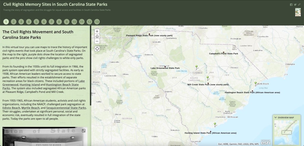 Through my time as an exhibit developer, I created several online ArcGIS Story Map exhibits in addition to revamping many of the outdoor historical waysides at various parks. “Civil Rights Memory Sites in SC State Parks” is an online virtual tour of all parks in South Carolina with civil rights history that utilizes mapping, historical photos, and links to multimedia resources. These digital exhibits make this history accessible to park visitors and anyone interested in this history.